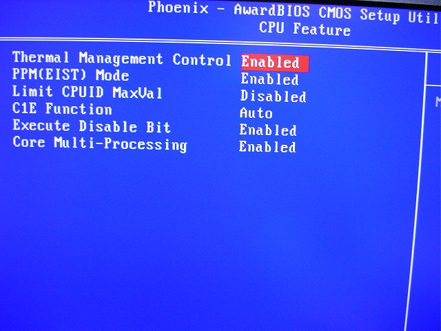 Genie BIOS Settingの項目を開く CPU Feature オーバークロックで省電力モードは必要ないので PMM(EIST) Mode C1E Function をDisabledにする 3Dゲームでも、ちょつと タイムラグ的なのが気になれば 省電力モードを解除しても良いと思う |