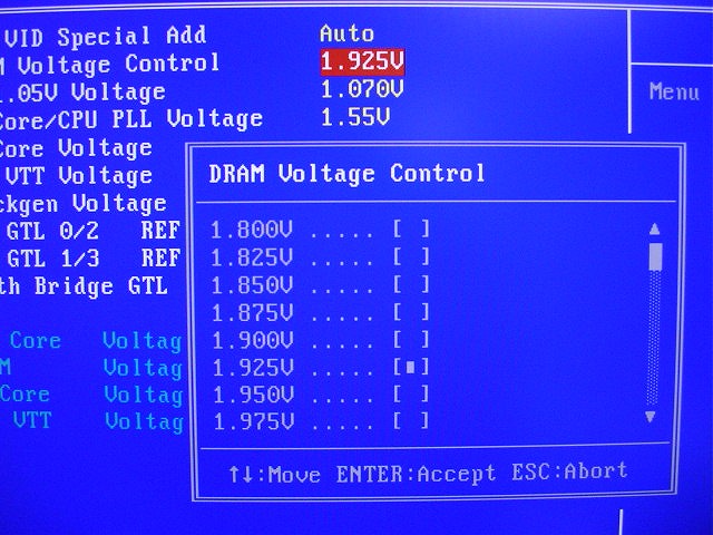 DRAM Voltage Control 普通のメモリの場合1.8V ハイエンド系だと 2.0v〜2.2Vが主です 不安定 たとえば ゲームしてると落ちる場合は 電圧を上げてみるのも手です 安定しないなら その後、タイミング調整やクロックダウンしてください メモリもCPUと同じように、電圧を上げれば 廻る場合が多いです パイ焼きの場合は3.0Vまで上げる人も多いですが 死亡するケースも多く 覚悟が必要です チャレンジャーですね 電圧を上げると発熱も高いので、冷却も忘れないで! 電圧を上げる=寿命も短くなる |
