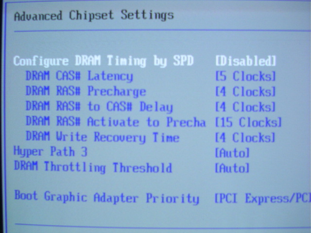 メモリタイミングの設定画面 基本的にはM/Bが自動で設定してくれます ただ、高価な高性能なメモリの場合 M/Bが、性能を低めに設定する場合があります その時に、メモリメーカー指定のタイミングに合わします オーバークロッカーはこの数値を低くして パイ焼きのタイムを早くしています なかなか、メモリが優秀でないと低い設定では 起動すらしません 起動後、メモテストでエラーが無いか確かめるのも良いです やたら4GB積んだメモリでも・・エラー出まくりだと 意味ないし〜〜〜 |
