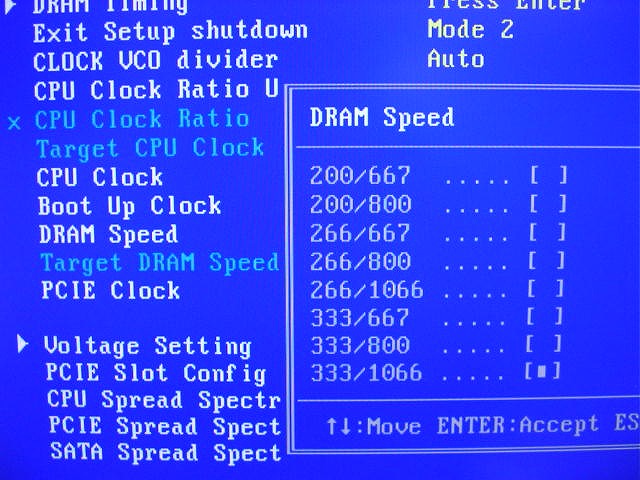 CPU Clock これをイジルのは自己責任となる オーバークロッカーなら限界まで上げようとする ただし、これはパイ焼きの場合 常用で、オーバークロックを楽しむなら 333の設定が無難だろう 今時のC2D C2Qなら軽く廻ると思う (たぶん Boot Up Clook これは、オーバークロックでの起動時に役立つ 普通 いきないり オーバークロックモードで 立ち上げるが、その場合 失敗するとこも多く 起動不能になる この機能は、立ち上げは低クロックで設定して起動 起動後にオーバークロックモードに自動的に変更する ありがたい機能である |