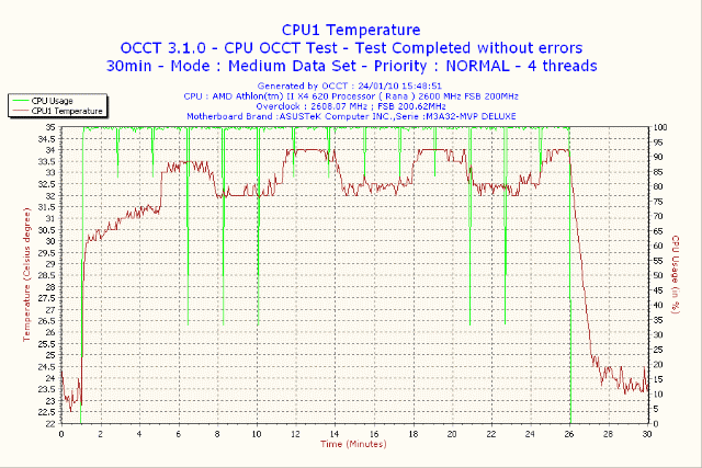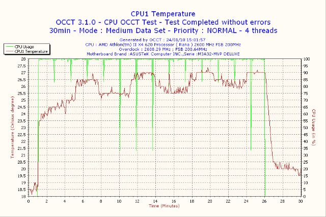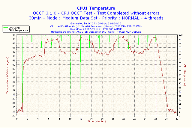 2年前に購入した製品だが、詳しく検証してなかったので 2010年1月24日 室温17度 検証してみた OCCTで30分の負荷のデーターです CPU はAthlon II X4 620 グリスなしでの検証 CPU温度 29度から47度まで上昇 |