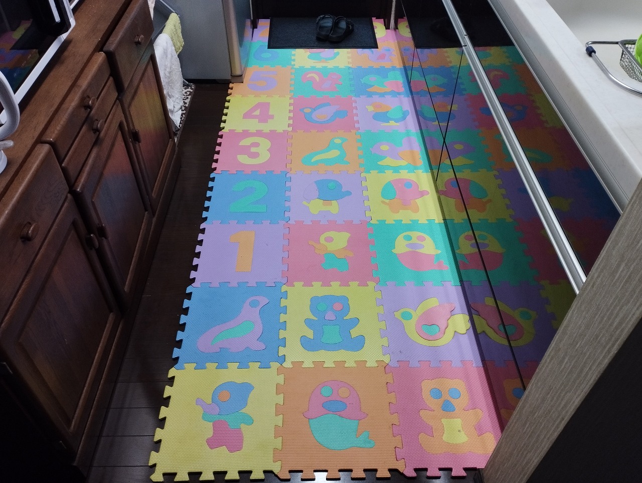 2026年1月18日 キッチンマットの交換 キッチンを明るく楽しい感じにしたかったので 捨てようと思ってた、子供用のマットを再利用しました |
