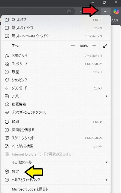 IEを閉じずに、赤色矢印 ・・・をクリックします 黄色矢印 設定を選択します |
