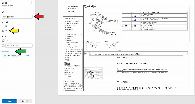 黄色矢印 縦横選択 緑色矢印 その他の設定 拡大縮小 |