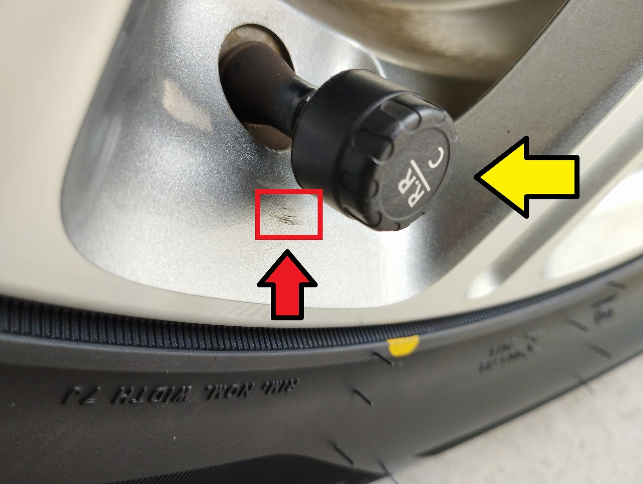 最初は、タイヤの組み換えの時の傷かと思いましたが タイヤ空気圧モニタリングシステムの センサーの可能性が高いです 角が当たって、傷をつけている感じです