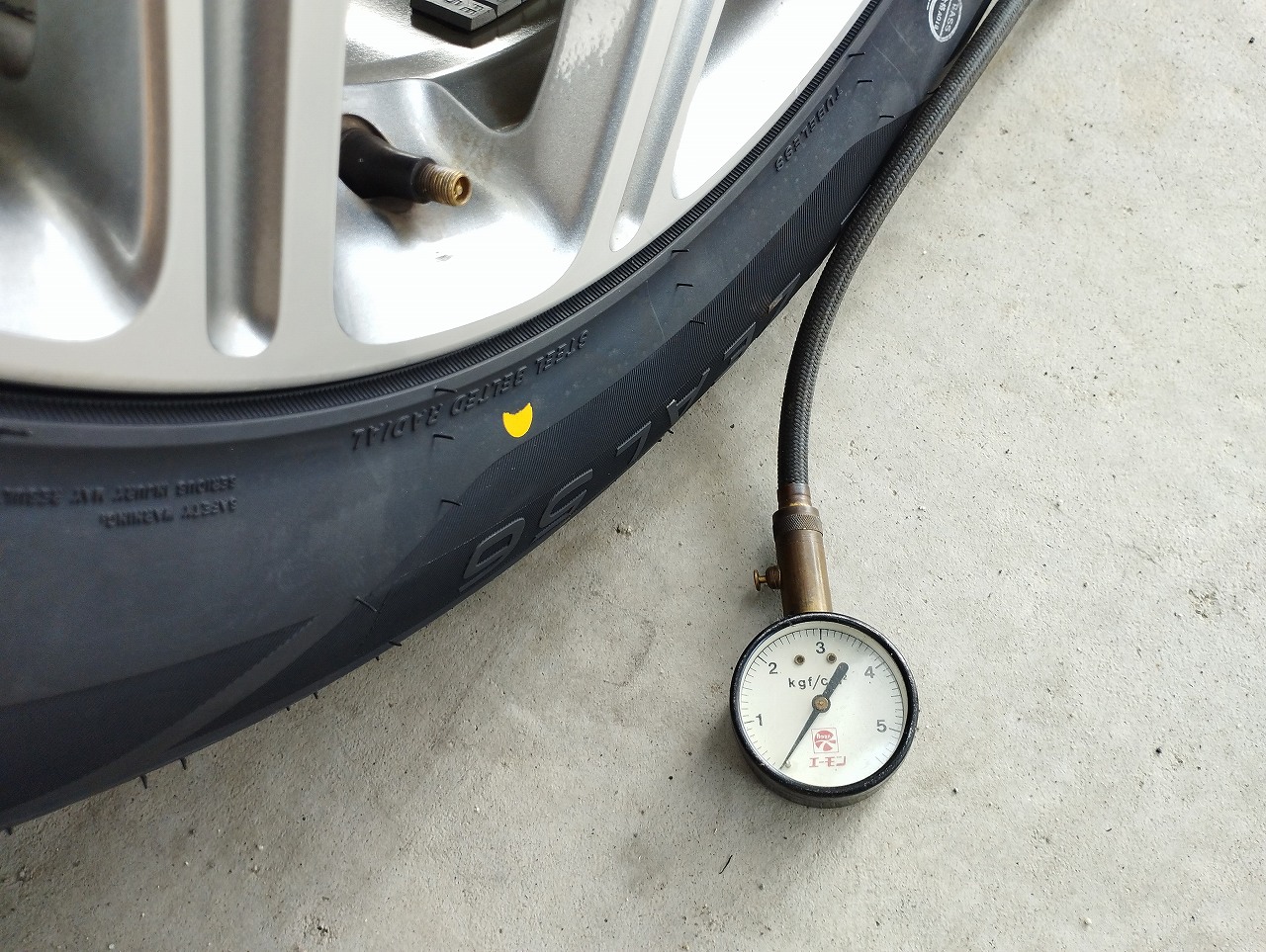 タイヤの空気圧は300kPaに設定していました GG2Wは、240kPaなのでオーバーしていますが これは、整備工場で違うかもしれませんが 空気圧チェックしてない人の対応だと思います